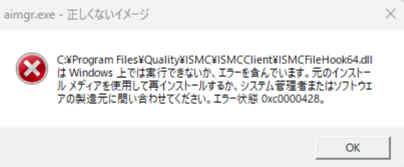 1. ダイアログに表示されているエラーコードが「0xc0000428」であることを確認します。